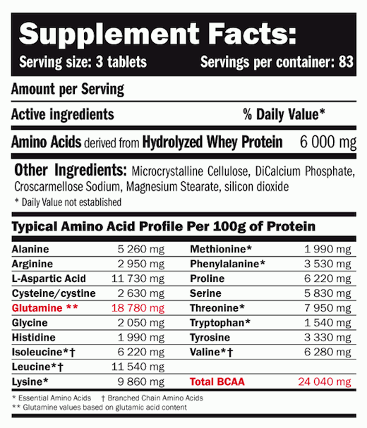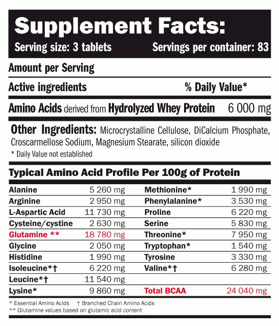Amix™ AMINO HYDRO-32 est une source d’acides aminés purs hydrolysés en comprimés de 2 000 mg de protéine de lactosérum. La formule hydrolysée est la formule la plus pure pour une absorption rapide et complète. Les acides aminés sont prédigérés, l'organisme humain n’a donc aucun effort à réaliser pour les absorber complètement. Cet hydrolysat contient également des peptides, nom donné aux petites combinaisons d’acides aminés de 1 à 10 acides aminés à absorption rapide. Amix™ AMINO HYDRO-32 est un produit à assimilation très rapide, il passe directement dans le sang améliorant ainsi la rétention d’azote et optimisant les bénéfices du produit. C’est une excellente source de protéines sans graisse. Amix™ AMINO HYDRO-32 ne contient aucun acide aminé de moindre qualité puisque sa composition est à 100 % d’hydrolysat de lactosérum.