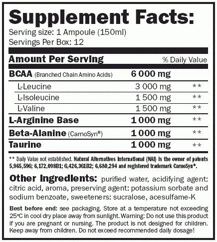 Amix™ BCAA MegaFuel 6000 est un complexe liquide dernière génération à base d'acides aminés ramifiés combinés à de la L-arginine, de la Taurine et de la Bêta-alanine (Carnosyn®). Cette forme liquide associée à une excellente composition assure une digestion et une métabolisation rapides et complètes des nutriments pour des résultats optimaux. Amix™ BCAA MegaFuel 6000 apporte une très grande quantité d’acides aminés, 6 000 mg. Ce produit est présenté sous forme d’ampoule double dose au format de poche facile à emporter : boire la moitié avant l'entraînement puis le reste après l'entraînement pour une protection optimale des fibres musculaires contre la dégradation post-entraînement.