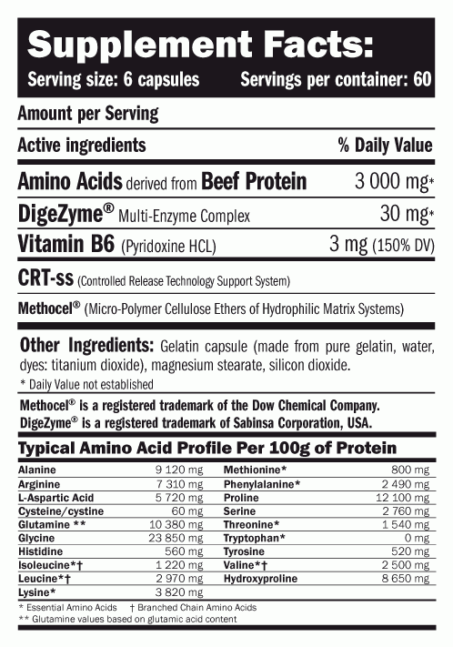 Amix™ BEEF Extra Amino est un composé à base d’acides aminés purs très concentrés. Les acides aminés sont un complément essentiel au niveau sportif pour la construction des muscles. Ils favorisent la production de l’hormone de croissance qui permet une amélioration de l’hypertrophie musculaire. Ils intéragissent avec les mécanismes de la douleur à travers les neurotransmetteurs et augmentent ainsi la résistance à la douleur afin d’améliorer les résultats. Parfaitement adapté aux sports de construction musculaire et aux sports de résistance, le composé d’acides aminés Amix™ BEEF Extra Amino contient l’ensemble des acides aminés, y compris les plus importants responsables de la construction des fibres musculaires. Les acides aminés sont considérés comme les "fondations" des muscles et Amix™ BEEF Extra Amino les apporte sous une forme concentrée en capsules faciles à digérer avec des bénéfices garantis. Les capsules contiennent également du METHOCEL® et du CRT-SS, des enzymes digestives qui facilitent l’absorption pour une métabolisation complète et un rendement optimal du produit.
