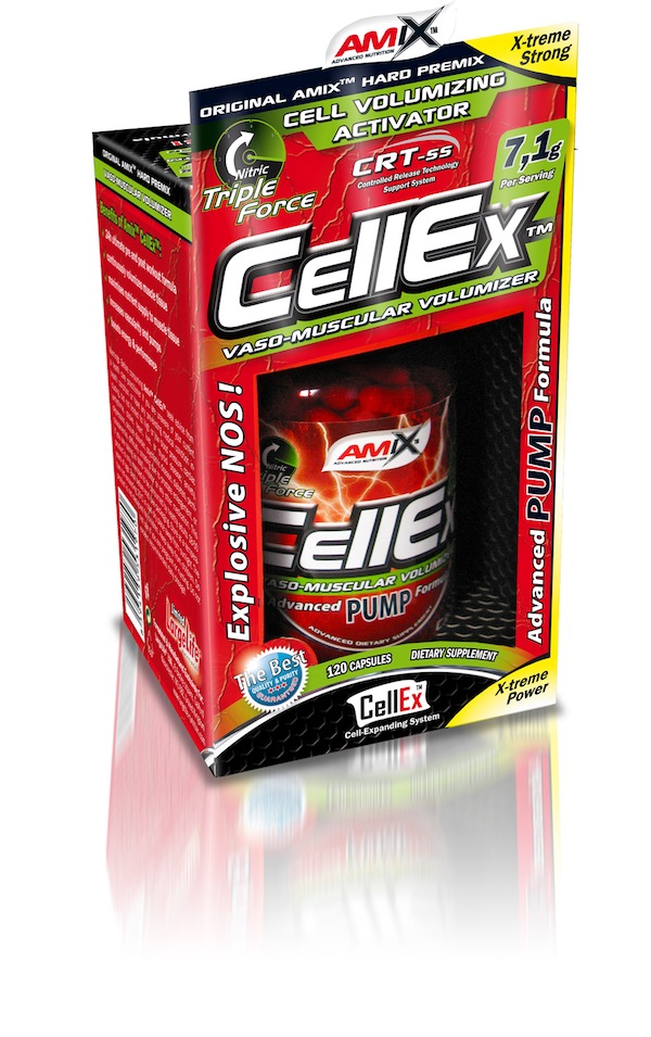 Amix™ CellEx™ capsules est un macro volumisateur vaso-musculaire de dernière génération. Amix™ a utilisé dans ce produit une technologie de pointe et la combinaison des meilleurs composants pour proposer le complément "round-the-clock" le plus sophistiqué. Cette formule pré et post-exercice augmente rapidement le flux sanguin dans le tissu musculaire pour améliorer le rendement, augmenter l'énergie et offrir une meilleure résistance en retardant la sensation de fatigue lors des entraînements durs et prolongés, afin de permettre d'augmenter le rythme de l'entraînement ainsi que la charge de poids et le rendement. Chaque capsule Amix™ CellEx™ contient un mélange de CVA (Cell Volumizing Activator), Matrice d'Arginine (triple oxyde d'azote), qui augmente la force, la congestion et la vasodilatation artérielle. Ce produit contient de la L-Citruline Malate qui pompe le sang vers les muscles en continu, augmente le rendement cardiovasculaire et permet une récupération plus rapide après les entraînements intensifs. Amix™ CellEx™ contient du Methocel® CRT-ss ( Controlled Release Technology Support System) qui garantit l'apport continu de nuriments, très importants pour le tissu musculaire, tout au long de la journée.