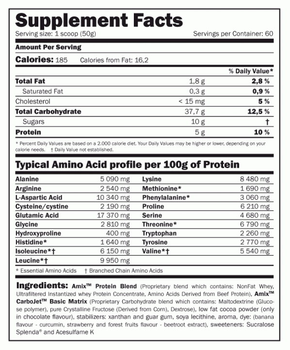 Amix™ CarboJet™ Basic est un mélange de glucides et de protéines de haute qualité spécialement formulé pour les athlètes d’élite et les culturistes souhaitant augmenter visiblement leur masse musculaire. CarboJet™ Basic contient un mélange de glucides complexes qui permet d’obtenir une source d’énergie puissante, constante et longue durée. Il contient également des protéines de première qualité favorisant la prise de masse musculaire sans graisse. Carbojet™ Basic contient une grande quantité de L-glutamine, un acide aminé qui participe activement à la récupération des fibres musculaires après un entraînement intensif. Carbojet™ Basic contient également une quantité élevée d’acides aminés ramifiés ou BCAA utiles à la fabrication de la masse musculaire. Sans aspartame, CarboJet™ Basic est un excellent complément pour les sportifs souhaitant augmenter leur force, leur résistance et leur masse musculaire sans graisse de manière naturelle.