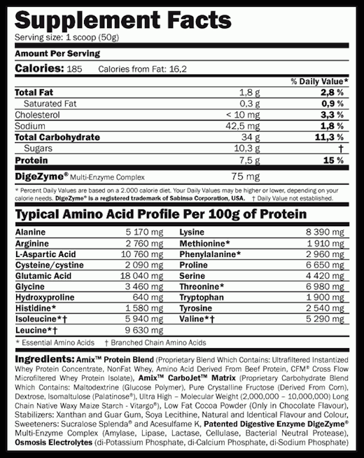 Amix™ CARBOJET™ GAIN est une excellente combination d'hydrates de carbone de haute qualité (VITARGO®, PALATINOSE®, MALTODEXTRINE), d'isolats de protéine de lactosérum (CFM) et de concentré de lactosérum ( W.P.C.) ultra et micro-filtrés a basse température afin de préserver tous leurs principes actifs intactes pour une valeur biologique optimale. Amix™ CARBOJET™ GAIN contient du Vitargo® un hydrate de carbone breveté et formulé spécialement pour les athlètes d'élite. Il apporte la dose nécessaire en glycogène pour augmenter l'énergie et la puissance musculaire tout en améliorant la récupération. Vitargo® dispose d'une structure moléculaire très grande et , grâce à sa taille, il passe plus rapidement à travers l'estomac, pour se diffuser dans le sang après le transit intestinal. Amix™ CARBOJET™ GAIN contient également du Palatinose un glucide avec un faible indice glycémique qui augmente considérablement la force, la puissance, la résistance et l'endurance musculaire, en contribuant ainsi à maintenir un rythme d'entrainement élevé sans baisse de forme. Il contient également de la Maltodextrine, un polymère de dextrose obtenu à partir de l'amidon naturel de maïs, de blé ou de pomme de terre. Cette combinaison de glucides fournit une énergie de longue durée car l'organisme les transforme progressivement en molécules de glucose qui sont alors absorbées rapidement. Cette excellente composition asociée aux protéines de première qualité font d'Amix™ CARBOJET™ GAIN le choix idéal pour les athlètes cherchant à augmenter leurs performances physiques ainsi qu'à augmenter de façon considérable leur prise musculaire sans graisse de manière saine et naturelle. Il contient également des enzymes digestives DIGEZYME® qui assurent une absorption totale pour une exploitation optimale de ses composants. Forte teneur en acides aminés ramifiés (BCAA) et essentiels, et la L-glutamine en grande proportion. Totalement sans aspartame. Goût délicieux, bonne texture et de digestion facile et rapide.