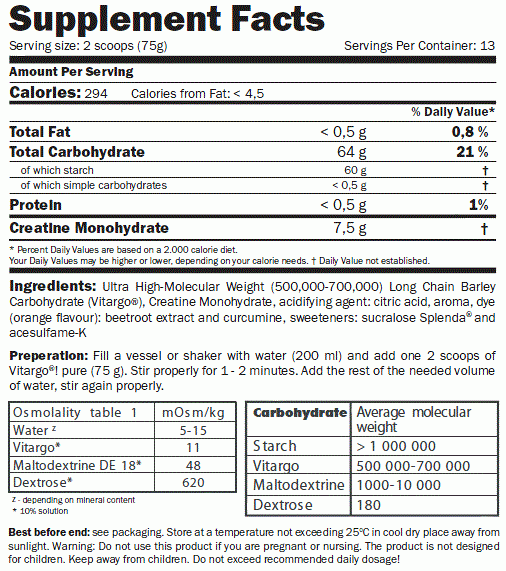 Amix™ VITARGO® avec KRE-ALKALYN® est une combinaison unique de deux des principaux composants brevetés du secteur, le VITARGO®, un hydrate de carbone de première qualité et la Kre-alkalyn®, une créatine à efficacité optimale. AMIX™ a mis au point une combinaison unique pour une efficacité optimale sans précédent. Vitargo® est le seul glucide breveté et formulé pour les athlètes d'élite qui couvre les besoins en énergie des muscles (glycogène). Vitargo® est un glucide avec une structure moléculaire plus grande que celle des glucides classiques utilisés dans le milieu sportif, il passe ainsi plus rapidement dans l'estomac pour se diffuser dans le sang après le transit intestinal. Plusieurs études ont démontré que sa consommation permet d'augmenter la force musculaire, en maintenant un rythme d'entraînement élevé sans baisse de forme. Amix™ VITARGO® contient également de la Kre-alkalyn®, une créatine dernière génération ayant un PH plus élevé que la créatine monohydrate dont l'absorption et la conversion sont plus lente : elle permet donc de bénéficier d'un effet prolongé. Elle reste stable jusqu'à son assimilation complète par les cellules musculaires. Les effets sont les suivants : augmentation de la force maximale, amélioration de la force explosive, augmentation de l'hypertrophie ou croissance musculaire, amélioration de la congestion musculaire et excellente récupération musculaire après un entraînement intensif. Amix™ VITARGO® + KRE-ALKALYN® est un excellent complément pour les sportifs recherchant une amélioration notable de leurs capacités physiques et une augmentation importante de la masse musculaire.