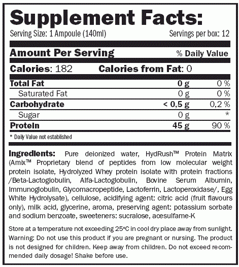 Ingrédients: eau pure désionisée, HydRush™ protéines de (Amix™ mélange de peptides breveté de protéines de faible poids moléculaire isolée, protéine de lactosérum hydrolysée isolé avec fractions protéiques / beta-lactoglobuline, Alpha-lactoglobuline, albumine sérique bovine, immunoglobulines, Glycomacro-peptides , lacto-ferrine, lacto-peroxydase /, blanc d'oeuf hydrolysé), cellulose, acidifiant: acide citrique (saveurs de fruits seulement), acide lactique, glycérine, arôme, conservateurs: sorbate de potassium et benzoate de sodium, édulcorants: sucralose, l'acésulfame- K