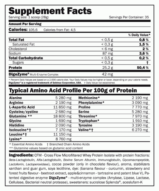 Amix™ IsoPrime CFM® Whey Isolate est une protéine pure à 90% ; un isolat pur de lactosérum de très bonne qualité obtenu par échange d'ions et flux croisé. Conçu spécialement pour offrir aux muscles croissance et récupération rapide après l'entraînement, sa forte teneur en acides aminés et son faible taux de graisse permettent une absorption rapide. Il contient également une grande quantité de L-glutamine, un acide aminé très important pour la récupération des fibres musculaires après un entraînement intensif. Sans aspartame, ce produit "ASPARTAME FREE" contient du SPLENDA®, un édulcorant naturel qui assure un goût délicieux sans graisse, ni sucres ajoutés. Il contient des enzymes digestives DIGEZYME® pour une absorption optimale. Amix™ IsoPrime CFM® Whey Isolate est donc une des meilleures protéines du marché. Elle est fabriquée à partir d'une technologie de dernière génération pour offrir une valeur biologique inégalable qui, associée à un entraînement physique, offre un effet anabolisant (croissance musculaire) de manière sûre, saine et naturelle.
