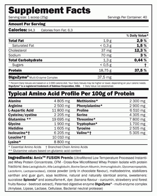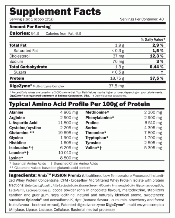 Amix™ WHEY PURE FUSION Protein, est un excellent isolat et concentré de lactosérum de qualité optimale avec une forte teneur en acides aminés ramifiés (BCAA) et essentiels: une protéine pure avec un taux de graisse quasiment nul. Intervient directement dans la construction de masse musculaire sans graisse, il est donc idéal pour les sportifs cherchant à augmenter leur masse musculaire de manière visible. Le processus d'ultrafiltration et de microfiltration à basse température permet d'obtenir une protéine d'une pureté parfaite avec une excellente absorption. Sa très forte teneur en glutamine contribue à une récupération optimisée après un entraînement intensif. Les enzymes digestives permettant une absorption complète, son goût délicieux et sa texture crémeuse sans aspartame font d'Amix™ FUSION une des meilleures protéines du marché.
