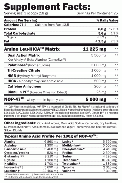 Amix™ Leu-HICA™ with NOP-47™ contient : Palatinose, un hydrate de carbone de très bas indice glycémique qui nous apporte une énergie constante pour un entraînement optimale ; Kre-Alkalyn®, une créatine breveté avec un PH plus haut que la créatine monohydrate, Kre-Alkalyn® augmente la force explosive et maximale, tout en augmentant la congestion musculaire.