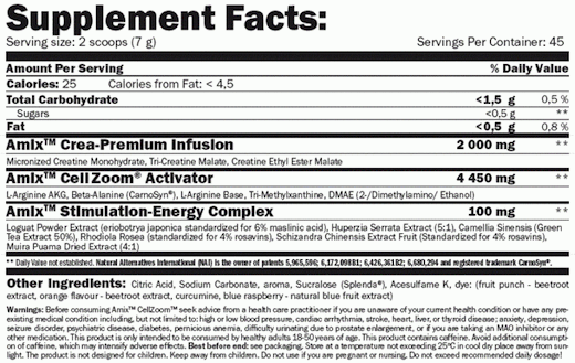 Amix™ CellZoom™ contient 3 types de créatine. Il contient de l'Oxyde nitrique, de l'arginine base, de la caféine, de la beta alanine, du DMAE et une longue liste de composants. Ses effets consistent en une augmentation du flux sanguin et de la congestion musculaire. Il augmente la concentration pendant l'entraînement et améliore la résistance en retardant l'apparition de la fatigue, ce qui permet de réaliser des entraînements plus intenses en augmentant la force musculaire. Il augmente considérablement la force et le volume musculaire. Amix™ CellZoom™ stimule le système nerveux ce qui permet une plus grande explosivité pendant l'entraînement. Amix™ CellZoom™ améliore de manière notable la récupération après l'entraînement en contribuant à la récupération des fibres, ce qui permet prise de masse musculaire.